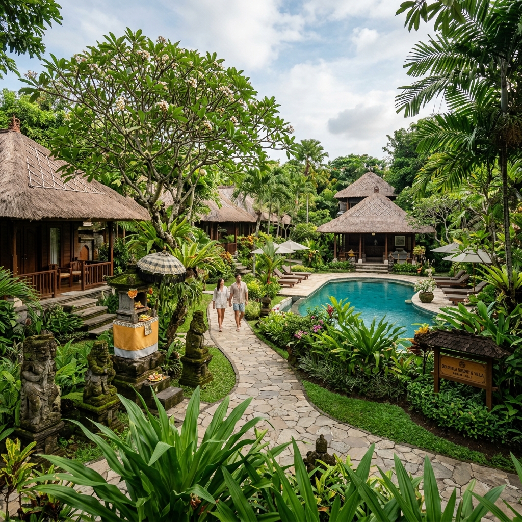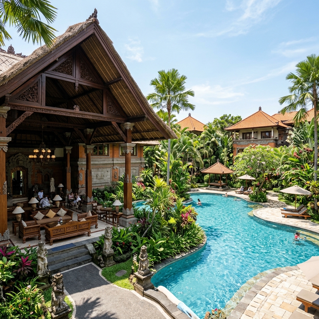 Hotel bergaya resor dengan taman tropis yang luas, kolam renang besar, fasilitas lengkap, dan sangat cocok untuk kegiatan menginap, seminar, maupun perjalanan wisata di kawasan Sanur.